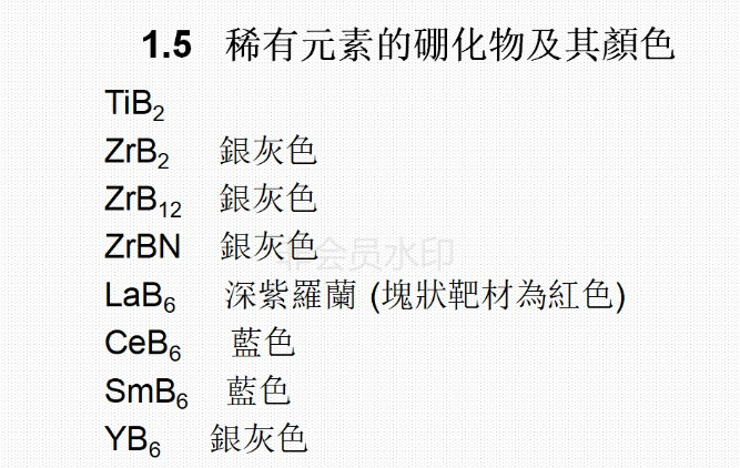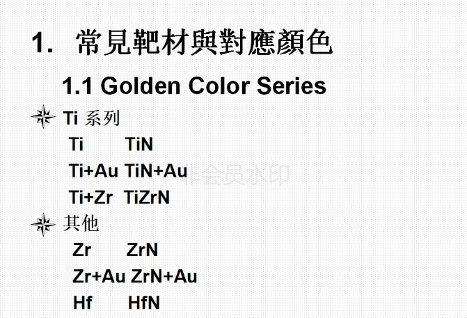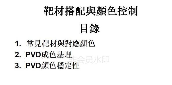 6)、目前能夠做出的膜層的顏色有深金黃色,淺金黃色,咖啡色、古銅色、灰色、黑色、灰黑色,七彩色等。通過控制鍍膜過程中的相關(guān)參數(shù),可以控制鍍出的顏色;鍍膜結(jié)束后可以用相關(guān)的儀器對顏色值進(jìn)行測量,使顏色得以量化,以確定所鍍出的顏色是否滿足要求。