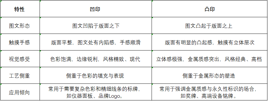 凸印(陽印):指圖文部分高于版面。通過腐蝕或沖壓使空白部分凹陷,保留圖文部分凸起。上色時(shí),可以對(duì)凸起部分進(jìn)行噴漆、電鍍等處理,或者保留鋁材本色,形成強(qiáng)烈的金屬質(zhì)感與觸摸感。